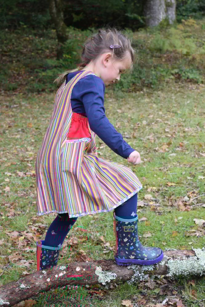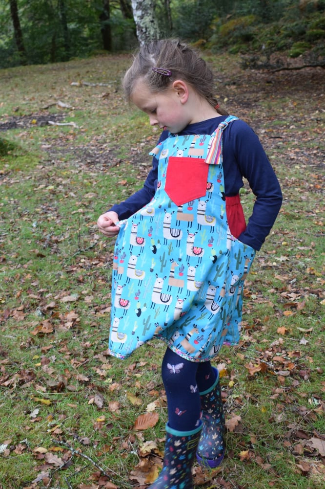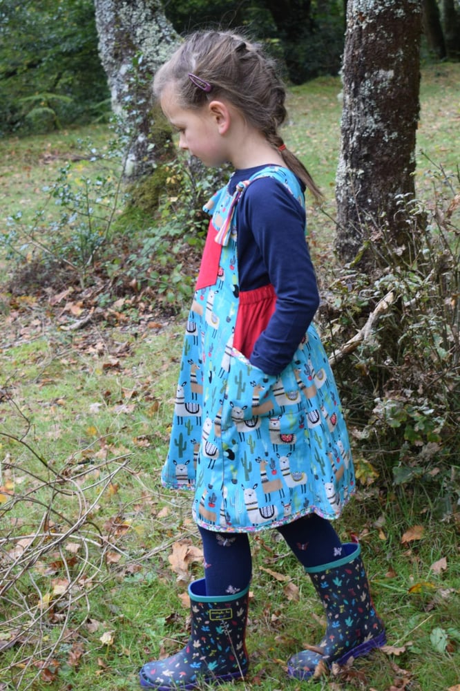 This practical handmade, reversible dungaree dress with pockets is a NEW design this year. It is made from a fun striped needlecord with a lovely llama design on the reverse. The amazing thing about this pinny is that it has pockets - inside and outside. The straps are easily adjusted with just a knot through a loop to fasten them. Each side has a contrast pocket. Felicity loved it!